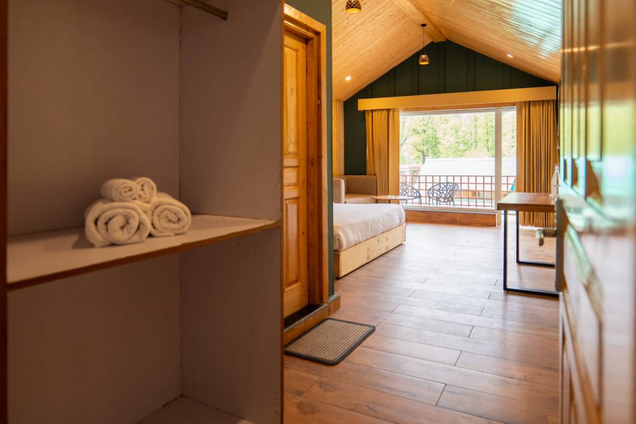 The Chalet Room combines rustic charm with contemporary luxury, reflecting the essence of a classic mountain lodge. With wooden accents, spacious layout, and panoramic outdoor views, it creates a warm, welcoming environment. Ideal for guests seeking an immersive Himalayan experience, the room ensures privacy, comfort, and a memorable stay amidst the natural beauty of Manali’s alpine landscapes.